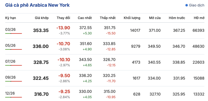 Tương tự, trên sàn New York, giá cà phê Arabica cũng ghi nhận phiên giảm giá sâu trong các kỳ giao hàng. Cụ thể, kỳ giao tháng 3/2026 giảm mạnh 13,9 cent/lb, đạt mức 353,35 cent/lb. Hợp đồng giao tháng 12/2026 cũng đảo chiều giảm đến 9,25 cent/lb, đạt mức 316,7 cent/lb.