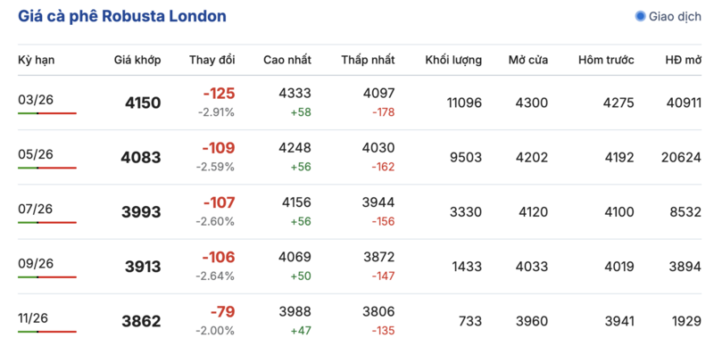 Kết thúc phiên giao dịch gần nhất, giá cà phê Robusta tại London ghi nhận phiên đảo chiều sụt giảm sâu trong các kỳ giao hàng. Cụ thể, kỳ giao tháng 1/2026 giảm đến 125 USD/tấn, xuống mức 4150 USD/tấn. Trong khi đó, hợp đồng giao kỳ hạn tháng 9/2026 cũng giảm 79 USD/tấn, đạt mức 3862 USD/tấn.