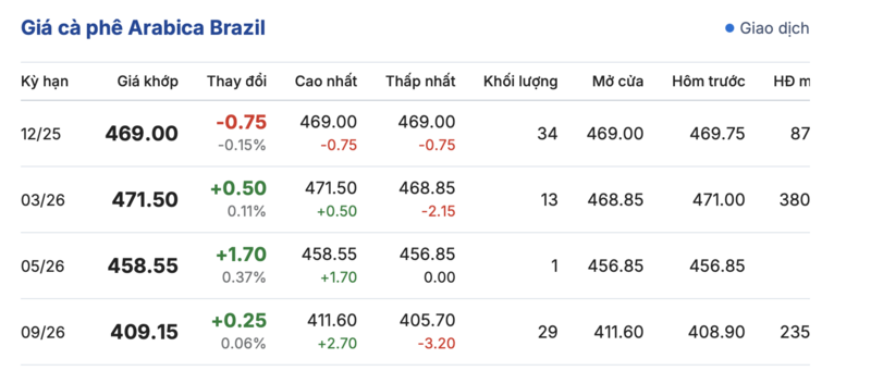 Kết thúc phiên giao dịch gần nhất, giá cà phê Arabica Brazil tiếp tục biến động trái chiều so với phiên giao dịch trước. Cụ thể: kỳ giao hàng tháng 12/2025 đạt mức 469,0 cent/lb, giảm nhẹ 0,75 cent/lb so với phiên giao dịch trước. Trái lại, kỳ giao hàng tháng 9/2026 tăng nhẹ 0,25 cent/lb, đạt mức 409,15 cent/lb.