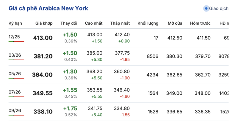 Tương tự, trên sàn New York, giá cà phê Arabica cũng ghi nhận tăng giá đồng loạt trong các kỳ giao hàng. Kỳ giao tháng 12/2025 tăng 1,5 cent/lb, đạt mức 413,0 cent/lb. Hợp đồng giao tháng 9/2026 tăng nhẹ 1,75 cent/lb, đạt mức 338,1 cent/lb.