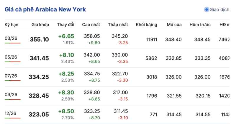 Tương tự, trên sàn New York, giá cà phê Arabica cũng ghi nhận tăng mạnh liên tục trong các kỳ giao hàng. Cụ thể, kỳ giao tháng 3/2026 tăng 6,65 cent/lb, đạt mức 355,1 cent/lb. Hợp đồng giao tháng 12/2026 cũng tăng mạnh 8,5 cent/lb, đạt mức 323,05 cent/lb.