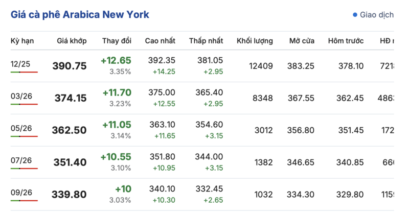 Trên sàn giao dịch New York, giá cà phê arabica cũng tăng nhẹ so với phiên giao dịch hôm qua. Cụ thể, hợp đồng giao tháng 12/2025 tăng 12,65 cent/pound so với hôm qua, đạt 390,75 US cent/pound. Hợp đồng giao tháng 3/2026 tăng 11,7 cent/pound, đạt 374,15 cent/pound.