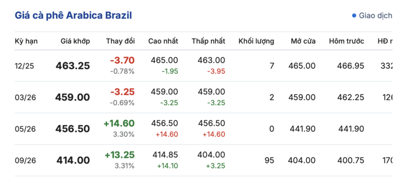 Trong khi đó, tại sàn giao dịch Brazil, giá cà phê Arabica biến động trái chiều so với ngày hôm qua. Cụ thể, hợp đồng giao kỳ hạn tháng 12/2025 đạt 463,25 US cent/pound, giảm 0,78% so với ngày hôm qua. Hợp đồng giao kỳ hạn tháng 3/2026 đạt 459,0 US cent/pound, giảm 0,69%. Trong khi hợp đồng giao tháng 5/2026 lại tăng mạnh, đạt 456,5 US cent/pound, tăng 3,3%.
