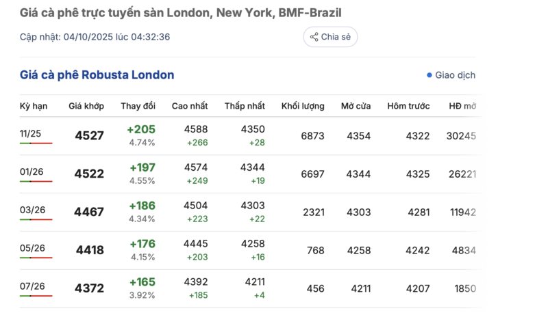 Trên sàn giao dịch London, giá cà phê trực tuyến robusta tăng mạnh so với phiên giao dịch trước. Cụ thể, hợp đồng giao kỳ hạn tháng 11/2025 tăng 205 USD/tấn, đạt mức 4527 USD/tấn. Hợp đồng giao kỳ hạn tháng 1/2026 cũng tăng 197 USD/tấn so với hôm qua, đạt 4522 USD/tấn...