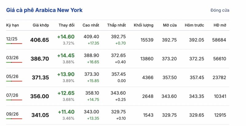 Tương tự, trên sàn New York, giá cà phê Arabica cũng ghi nhận sự phục hồi nhanh chóng. Kỳ giao tháng 12/2025 tăng 14,6 cent/lb, lên mức 406,65 cent/lb. Hợp đồng giao tháng 9/2026 tăng 11,4 cent/lb, đạt mức 341,05 cent/lb.