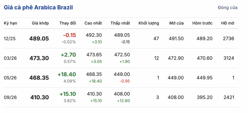 Trong khi đó, kết thúc phiên giao dịch gần nhất, giá cà phê Arabica Brazil lại biến động trái chiều so với phiên giao dịch trước. Cụ thể: kỳ giao hàng tháng 12/2025 là 489,05 cent/lb, giảm 0,15 cent/lb so với phiên giao dịch trước. Kỳ giao hàng tháng 9/2026 tăng 2,7 cent/lb, ở mức 473,3 cent/lb.