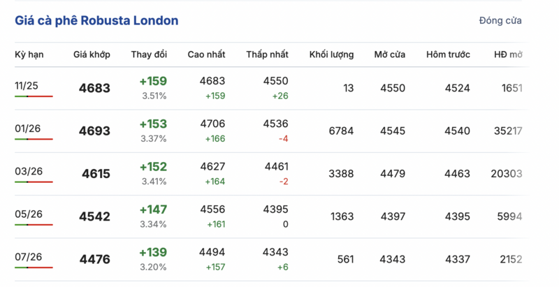Kết thúc phiên giao dịch gần nhất, giá cà phê Robusta tại London đồng loạt tăng mạnh trong các kỳ giao hàng. Cụ thể, kỳ giao tháng 11/2025 tăng 159 USD/tấn, đạt mức 4.683 USD/tấn. Hợp đồng giao kỳ hạn tháng 3/2026 cũng tăng 152 USD/tấn, lên mức 4.615 USD/tấn.