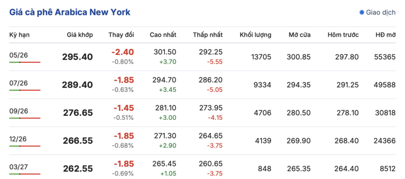 Trong khi đó, trên sàn New York, giá cà phê Arabica hôm nay cũng ghi nhận phiên giảm giá. Cụ thể, kỳ giao tháng 5/2026 giảm nhẹ 2,4 cent/lb, đạt mức 295,4 cent/lb. Hợp đồng giao kỳ hạn tháng 3/2027 tiếp tục giảm nhẹ 1,85 cent/lb, xuống mức 262,55 cent/lb.
