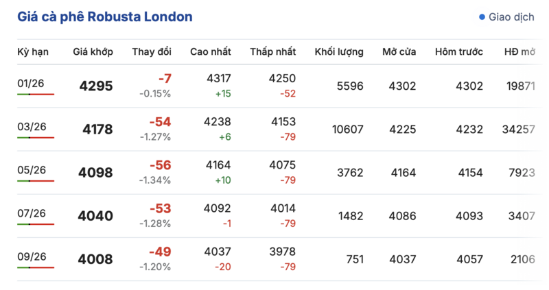 Kết thúc phiên giao dịch gần nhất, giá cà phê Robusta tại London đồng loạt giảm liên tục qua các kỳ giao hàng. Cụ thể, kỳ giao tháng 1/2026 giảm nhẹ 27 USD/tấn, đạt mức 4295 USD/tấn. Trong khi hợp đồng giao kỳ hạn tháng 9/2026 giảm 49 USD/tấn, đạt mức 4008 USD/tấn.