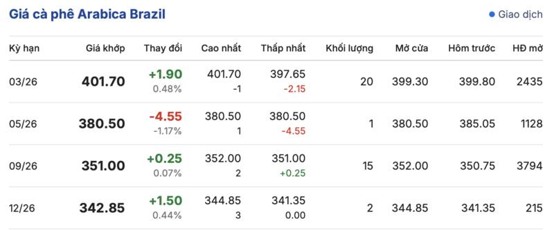 Kết thúc phiên giao dịch gần nhất, cà phê Arabica Brazil tiếp tục ghi nhận phiên biến động trái chiều trong các kỳ giao hàng. Cụ thể: kỳ hạn tháng 3/2026 đạt mức 401,7 cent/lb, tiếp tục tăng nhẹ 1,9 cent/lb so với hôm qua. Trái lại, kỳ giao hàng tháng 5/2026 lại ghi nhận giảm nhẹ 4,55 cent/lb, xuống mức 380,5 cent/lb.