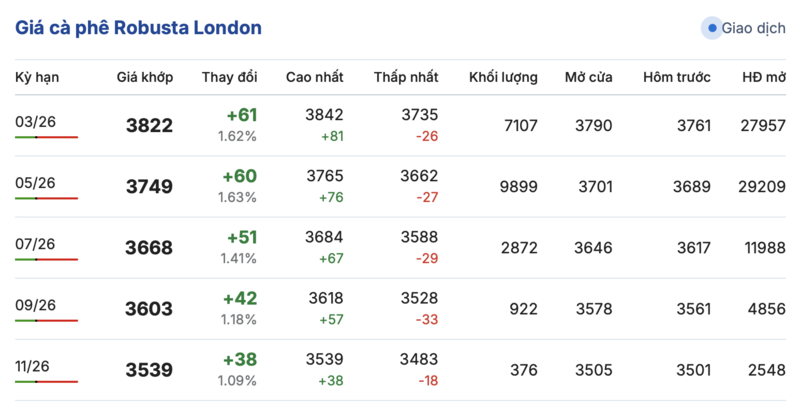 Kết thúc phiên giao dịch gần nhất, giá cà phê Robusta tại London đảo chiều tăng đồng loạt trong các kỳ giao hàng. Cụ thể, kỳ giao tháng 1/2026 tăng 61 USD/tấn, lên mức 3822 USD/tấn. Trong khi đó, hợp đồng giao kỳ hạn tháng 9/2026 cũng tăng nhẹ 38 USD/tấn, đạt mức 3539 USD/tấn.