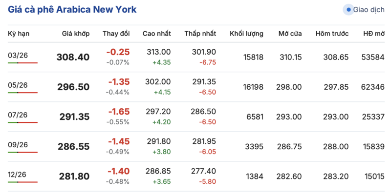 Trái lại, trên sàn New York, giá cà phê Arabica tiếp tục ghi nhận giảm đồng loạt trong các kỳ giao hàng. Cụ thể, kỳ giao tháng 3/2026 tiếp tục giảm nhẹ 0,25 cent/lb, xuống mức 308,4 cent/lb. Tương tự, hợp đồng giao tháng 12/2026 cũng tiếp tục giảm nhẹ 1,4 cent/lb, đạt mức 281,8 cent/lb.