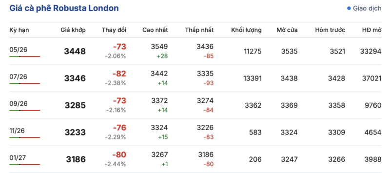 Cụ thể, trên sàn giao dịch London, giá cà phê Robusta sáng nay ghi nhận phiên đảo chiều, giảm mạnh đồng loạt trong các kỳ giao hàng so với phiên giao dịch trước. Trong đó, kỳ giao tháng 3/2026 giảm 73 USD/tấn, đạt mức 3.448 USD/tấn. Cùng chiều, hợp đồng giao kỳ hạn tháng 1/2027 cũng giảm mạnh 80 USD/tấn, xuống mức 3.186 USD/tấn.