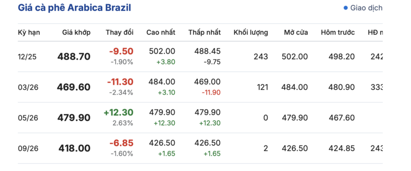 Kết thúc phiên giao dịch gần nhất, giá cà phê Arabica Brazil cũng biến động trái chiều so với phiên giao dịch trước. Cụ thể: kỳ giao hàng tháng 12/2025 là 488,7 cent/lb, giảm 9,5 cent/lb so với phiên giao dịch trước. Kỳ giao hàng tháng 9/2026 giảm 6,85 cent/lb, ở mức 411,55 cent/lb.