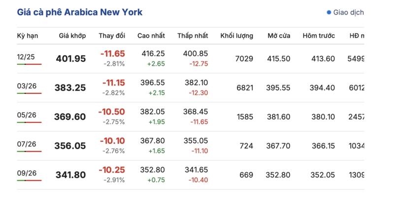 Trong khi đó, trên sàn New York, giá cà phê Arabica lại ghi nhận sự sụt giảm mạnh đồng loạt trong các kỳ giao hàng. Kỳ giao tháng 12/2025 giảm 11,65 cent/lb, xuống mức 404,95 cent/lb. Hợp đồng giao tháng 9/2026 giảm 10,25 cent/lb, xuống mức 341,8 cent/lb.