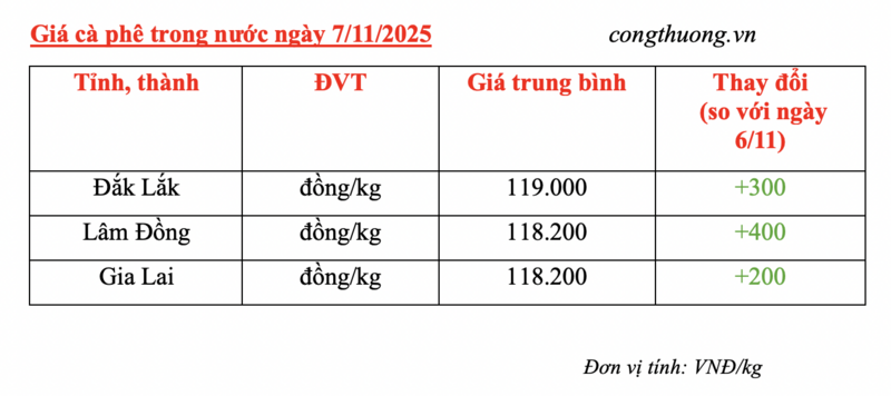Giá cà phê trong nước hôm nay (7/11) tại các vùng trọng điểm Tây Nguyên tăng nhẹ so với ngày hôm qua từ 200 - 400 đồng đồng/kg. Hiện giá cà phê đang dao động trong khoảng 118.200 - 119.000 đồng/kg.