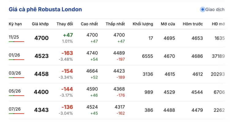 Kết thúc phiên giao dịch gần nhất, giá cà phê Robusta tại London biến động trái chiều trong các kỳ giao hàng. Cụ thể, kỳ giao tháng 11/2025 tăng nhẹ 47 USD/tấn, đạt mức 4.653 USD/tấn. Trong khi hợp đồng giao kỳ hạn tháng 3/2026 giảm mạnh 154 USD/tấn, xuống mức 4.458 USD/tấn.