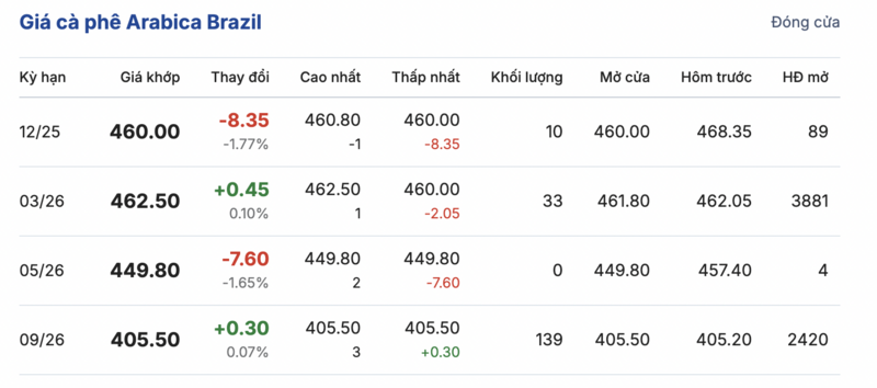 Kết thúc phiên giao dịch gần nhất, giá cà phê Arabica Brazil biến động trái chiều so với phiên giao dịch trước. Cụ thể: kỳ giao hàng tháng 12/2025 đạt mức 460,0 cent/lb, giảm mạnh 8,35 cent/lb so với phiên giao dịch trước. Trái lại, kỳ giao hàng tháng 9/2026 tăng nhẹ 0,3 cent/lb, đạt mức 405,5 cent/lb.