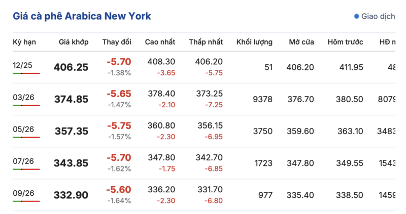 Tương tự, trên sàn New York, giá cà phê Arabica cũng ghi nhận giảm mạnh đồng loạt trong các kỳ giao hàng. Kỳ giao tháng 12/2025 giảm 5,7 cent/lb, đạt mức 406,25 cent/lb. Hợp đồng giao tháng 9/2026 giảm 5,6 cent/lb, đạt mức 332,9 cent/lb.