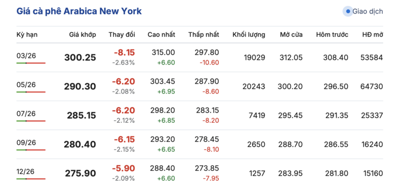 Tương tự, trên sàn New York, giá cà phê Arabica tiếp tục ghi nhận giảm mạnh đồng loạt trong các kỳ giao hàng. Cụ thể, kỳ giao tháng 3/2026 tiếp tục giảm 8,15 cent/lb, xuống mức 300,25 cent/lb. Cùng chiều, hợp đồng giao tháng 12/2026 cũng tiếp tục giảm 5,9 cent/lb, đạt mức 275,9 cent/lb.