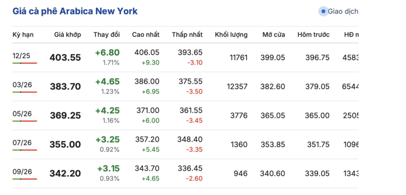 Trong khi đó, trên sàn New York, giá cà phê Arabica lại ghi nhận sự tăng giá đồng loạt trong các kỳ giao hàng. Kỳ giao tháng 12/2025 tăng 6,8 cent/lb, lên mức 403,55 cent/lb. Hợp đồng giao tháng 9/2026 tăng 3,15 cent/lb, đạt mức 342,2 cent/lb.