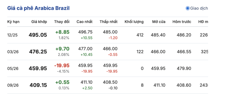Kết thúc phiên giao dịch gần nhất, giá cà phê Arabica Brazil cũng biến động trái chiều so với phiên giao dịch trước. Cụ thể: kỳ giao hàng tháng 12/2025 là 495,05 cent/lb, tăng 8,85 cent/lb so với phiên giao dịch trước. Kỳ giao hàng tháng 5/2026 giảm 19,95 cent/lb, xuống mức 459,95 cent/lb.