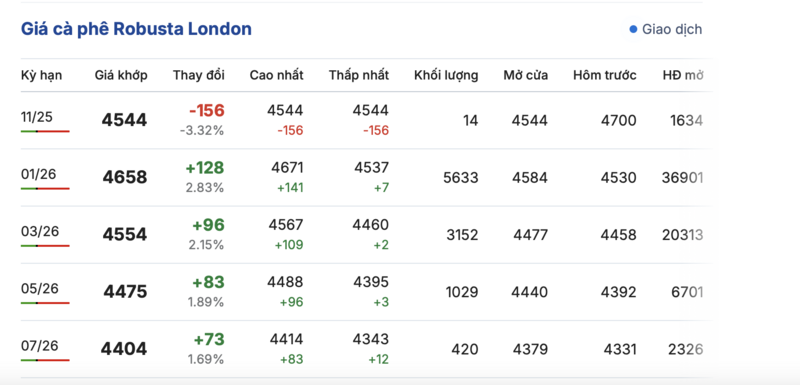 Kết thúc phiên giao dịch gần nhất, giá cà phê Robusta tại London biến động trái chiều trong các kỳ giao hàng. Cụ thể, kỳ giao tháng 11/2025 giảm mạnh 156 USD/tấn, xuống mức 4.544 USD/tấn. Trong khi hợp đồng giao kỳ hạn tháng 3/2026 tăng 96 USD/tấn, lên mức 4.554 USD/tấn.