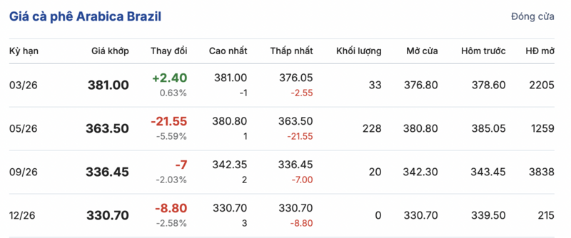 Kết thúc phiên giao dịch gần nhất, cà phê Arabica Brazil tiếp tục ghi nhận phiên biến động trái chiều trong các kỳ giao hàng. Cụ thể: kỳ hạn tháng 3/2026 đạt mức 381,0 cent/lb, đảo chiều tăng nhẹ 2,4 cent/lb so với hôm qua. Trái lại, kỳ giao hàng tháng 12/2026 lại ghi nhận giảm mạnh 8,8 cent/lb, xuống mức 330,7 cent/lb.