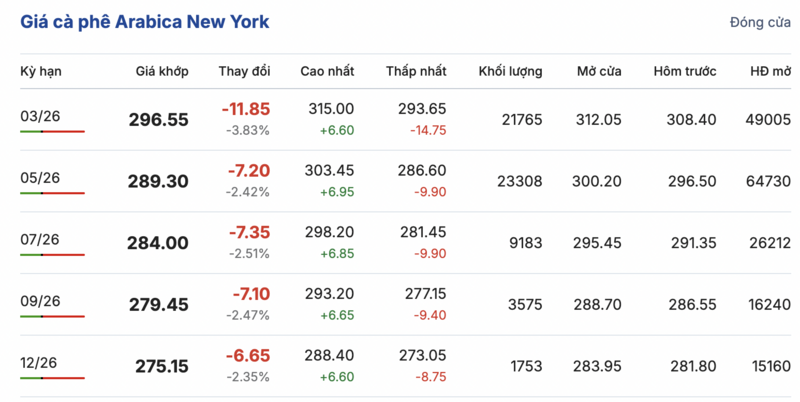 Tương tự, trên sàn New York, giá cà phê Arabica tiếp tục ghi nhận giảm mạnh đồng loạt trong các kỳ giao hàng. Cụ thể, kỳ giao tháng 3/2026 tiếp tục giảm mạnh 11,85 cent/lb, xuống mức 296,55 cent/lb. Cùng chiều, hợp đồng giao tháng 12/2026 cũng tiếp tục giảm 6,65 cent/lb, đạt mức 275,15 cent/lb.
