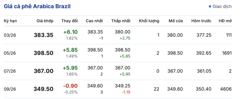 Kết thúc phiên giao dịch gần nhất, giá cà phê Arabica trên sàn Brazil ghi nhận phiên biến động trái chiều trong các kỳ giao hàng. Cụ thể: kỳ hạn tháng 3/2026 đạt mức 383,35 cent/lb, tăng mạnh 6,1 cent/lb so với hôm qua. Trái lại, kỳ giao hàng tháng 5/2026 ghi nhận đảo chiều giảm nhẹ 0,9 cent/lb, xuống mức 349,5 cent/lb.