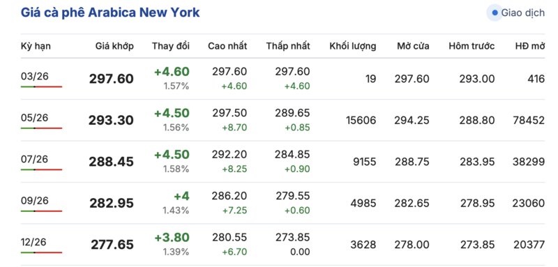 Trên sàn New York, giá cà phê Arabica tiếp tục ghi nhận phiên tăng nhẹ đồng loạt trong các kỳ giao hàng. Cụ thể, kỳ giao tháng 3/2026 tăng nhẹ 4,6 cent/lb, đạt mức 297,6 cent/lb. Cùng chiều, hợp đồng giao tháng 12/2026 cũng tăng nhẹ 3,8 cent/lb, đạt mức 277,65 cent/lb.