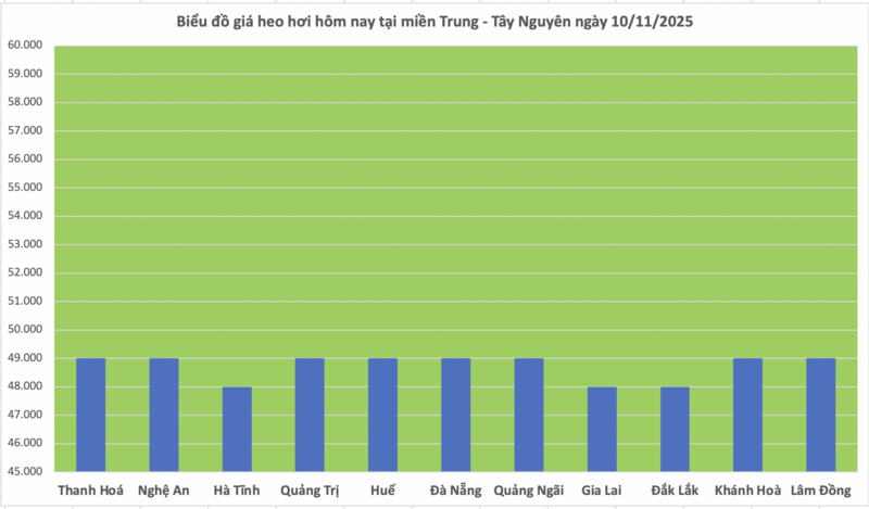 Các địa phương còn lại như Quảng Trị, Huế, Đà Nẵng, Quảng Ngãi, Khánh Hòa và Lâm Đồng duy trì mức 49.000 đồng/kg; trong khi Gia Lai và Đắk Lắk vẫn giữ mức thấp nhất khu vực là 48.000 đồng/kg.