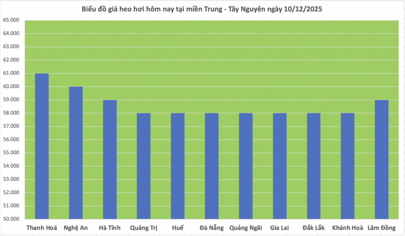Các nơi như Thanh Hóa, Hà Tĩnh, Quảng Trị, Huế, Đà Nẵng, Quảng Ngãi, Gia Lai, Đắk Lắk, Khánh Hòa và Lâm Đồng đều giữ nguyên giá thu mua so với hôm trước. Mức giá cao nhất miền 60.000 đồng/kg được duy trì tại Thanh Hóa.
