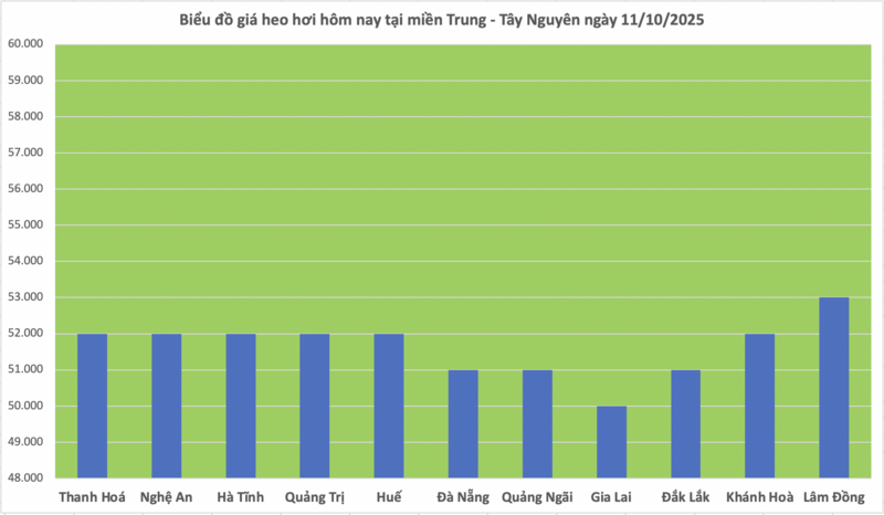 Các tỉnh còn lại như Hà Tĩnh, Quảng Trị, Huế, Đà Nẵng, Quảng Ngãi và Gia Lai giữ nguyên giá, dao động từ 50.000 đồng/kg đến 52.000 đồng/kg.