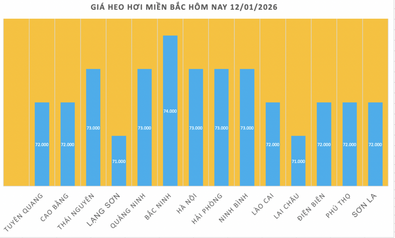 Giá heo hơi miền Bắc hôm nay (12/1/2026) tăng mạnh, lập đỉnh mới - 74.000 đồng/kg tại nhiều địa phương, có nơi tăng đến 2.000 đồng/kg. Hiện giá heo tại miền Bắc dao động trong khoảng 71.000 - 74.000 đồng/kg.