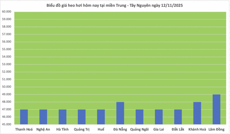 Các địa phương Thanh Hóa, Nghệ An, Hà Tĩnh, Quảng Trị, Huế, Quảng Ngãi và Gia Lai tiếp tục duy trì mức 47.000 đồng/kg.