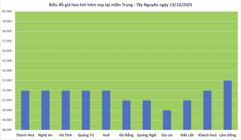 Cụ thể, Thanh Hóa, Nghệ An, Hà Tĩnh, Quảng Trị, Khánh Hòa và Huế giữ giá 52.000 đồng/kg; Quảng Ngãi, Đà Nẵng và Đắk Lắk ở mức 51.000 đồng/kg; Gia Lai tiếp tục là địa phương có giá thấp nhất khu vực với 50.000 đồng/kg. Lâm đồng giữ mức cao nhất khu vực là 53.000 đồng/kg.