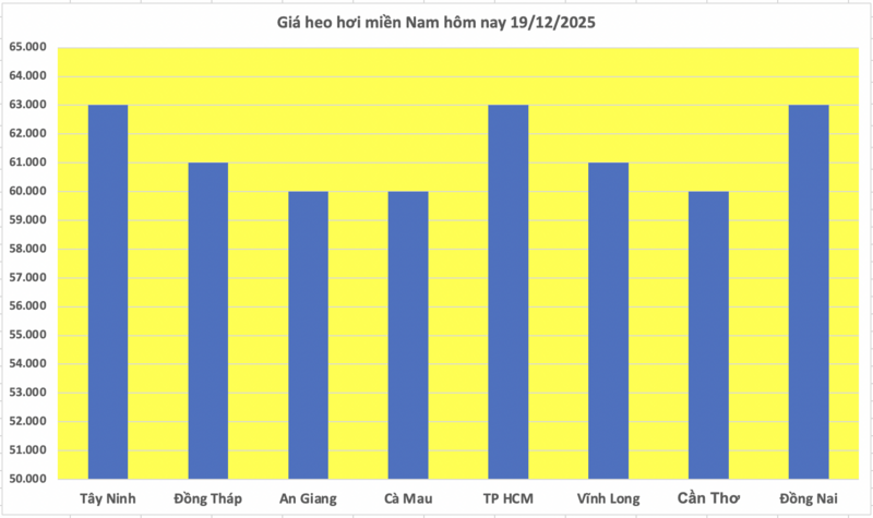 Mức giá cao nhất khu vực vẫn được duy trì ở ngưỡng 63.000 đồng/kg, ghi nhận tại Đồng Nai, Tây Ninh và TP. Hồ Chí Minh. Hai địa phương Đồng Tháp và Vĩnh Long đứng ở mức 61.000 đồng/kg. Các tỉnh An Giang, Cà Mau và Cần Thơ tiếp tục neo ở mức thấp nhất vùng là 60.000 đồng/kg.