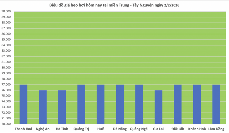 Các địa phương còn lại như Quảng Trị, Huế, Đà Nẵng, Quảng Ngãi, Đắk Lắk, Khánh Hòa và Lâm Đồng tiếp tục đi ngang ở mức 77.000 đồng/kg. Gia Lai duy trì ổn định tại 76.000 đồng/kg.