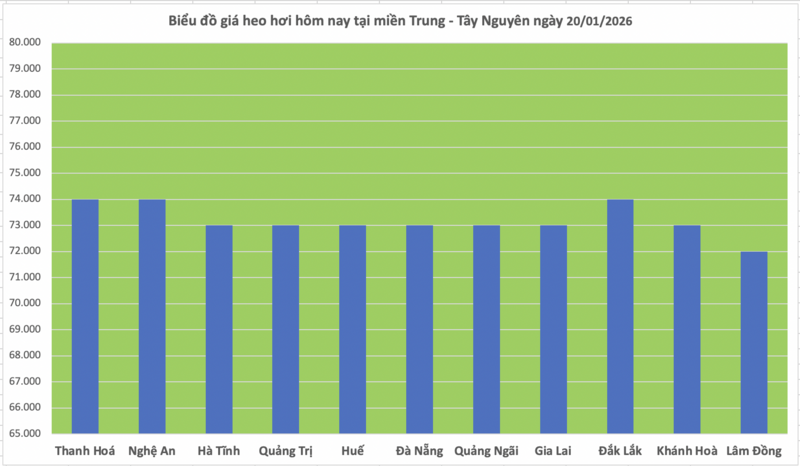 Các địa phương gồm Hà Tĩnh, Quảng Trị, Huế, Đà Nẵng, Quảng Ngãi, Gia Lai và Khánh Hòa đồng loạt tăng 1.000 đồng/kg, hiện thu mua tại 73.000 đồng/kg.