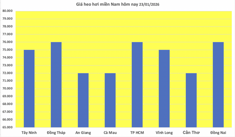 Cụ thể, Đồng Nai, Đồng Tháp và TP. Hồ Chí Minh cùng tăng 1.000 đồng/kg, hiện thu mua tại 76.000 đồng/kg, là mức cao nhất khu vực. Tây Ninh tăng 1.000 đồng/kg, đạt 75.000 đồng/kg.