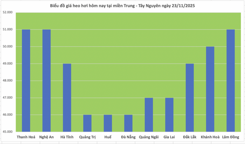 Trong khi đó, các địa phương còn lại giữ mức giá cả ổn định: Hà Tĩnh và Đắk Lắk ở mức 49.000 đồng/kg; Quảng Trị, Huế và Đà Nẵng cùng ở mức 46.000 đồng/kg; Quảng Ngãi và Gia Lai duy trì 47.000 đồng/kg; Khánh Hòa giữ mức 50.000 đồng/kg.