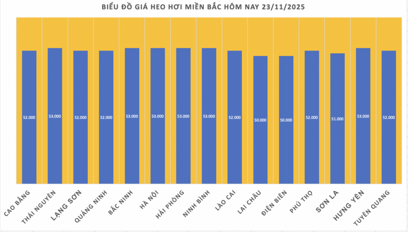 Giá heo tại Thái Nguyên, Bắc Ninh, Hà Nội, Ninh Bình và Hưng Yên cùng đạt mức 53.000 đồng/kg. Các tỉnh Cao Bằng, Lạng Sơn, Quảng Ninh và Lào Cai hiện giữ mức 52.000 đồng/kg.