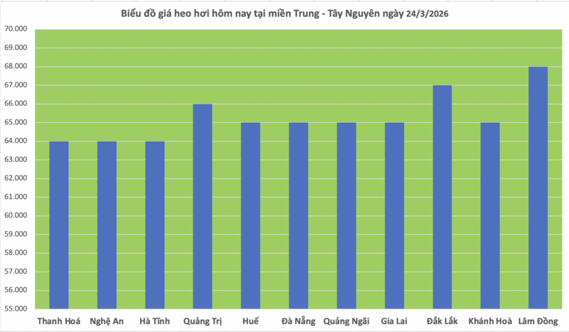 Trong khi đó, các địa phương còn lại không ghi nhận biến động. Cụ thể, Quảng Trị giữ mức 66.000 đồng/kg; Huế, Đà Nẵng, Quảng Ngãi, Gia Lai và Khánh Hòa cùng duy trì mức 65.000 đồng/kg; Đắk Lắk giữ mức 67.000 đồng/kg; Lâm Đồng tiếp tục là địa phương có giá cao nhất khu vực với 68.000 đồng/kg.