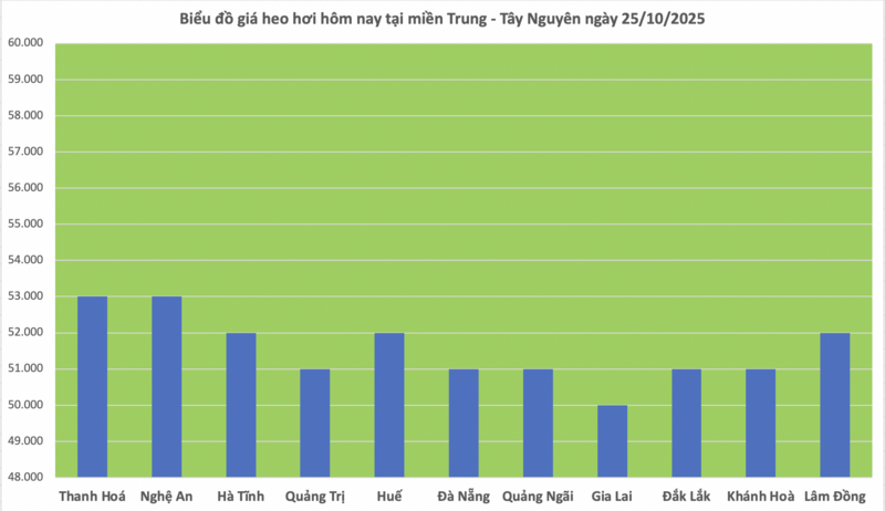 Theo đó, giá heo tại thị trường Thanh Hóa và Nghệ An hiện được thu mua ở mức 53.000 đồng/kg, cao nhất khu vực. Hà Tĩnh, Huế và Lâm Đồng cùng ghi nhận 52.000 đồng/kg. Các tỉnh Quảng Trị, Đà Nẵng, Quảng Ngãi, Đắk Lắk và Khánh Hòa giao dịch ở mức 51.000 đồng/kg, trong khi Gia Lai vẫn là địa phương có giá thấp nhất khu vực ở 50.000 đồng/kg.