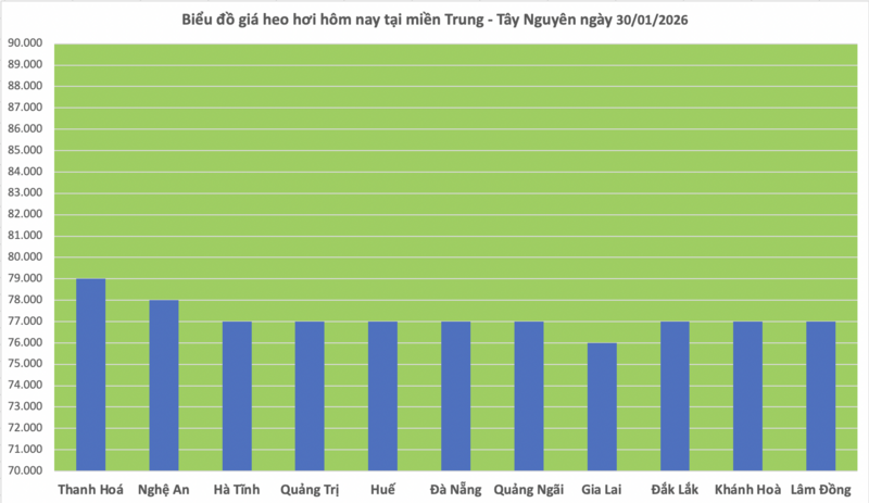 Tại khu vực miền Trung – Tây Nguyên, giá heo hơi hôm nay ghi nhận giảm nhẹ tại một số địa phương, các tỉnh còn lại đi ngang. Hiện giá heo tại miền Trung - Tây Nguyên dao động trong khoảng 76.000 - 79.000 đồng/kg.
