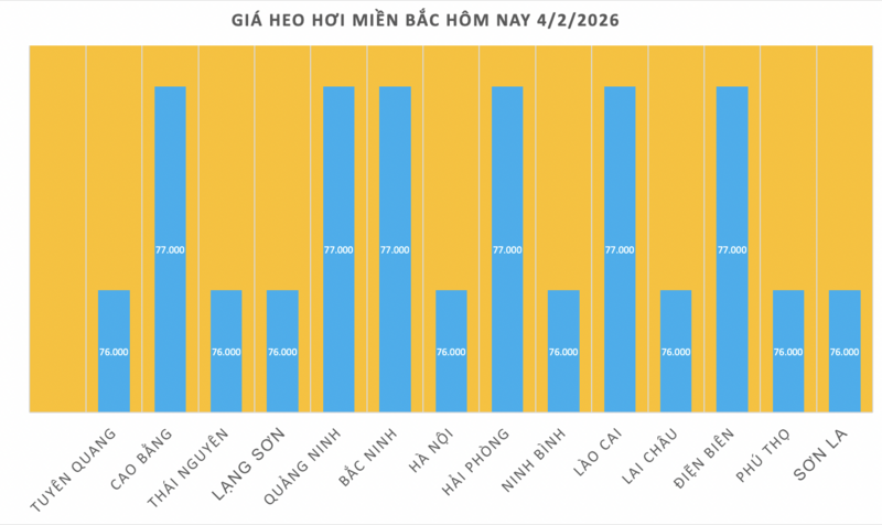 Các địa phương còn lại duy trì giá cả ổn định. Trong đó, Cao Bằng, Quảng Ninh, Bắc Ninh, Hải Phòng, Lào Cai và Điện Biên giữ giá 77.000 đồng/kg. Heo hơi tại Tuyên Quang, Thái Nguyên, Hà Nội, Lai Châu và Phú Thọ tiếp tục được giao dịch ở mức 76.000 đồng/kg.