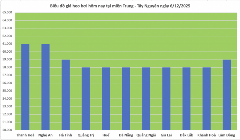Khu vực miền Trung – Tây Nguyên ghi nhận tăng giá tại hầu hết các nơi, với mức tăng cao nhất là 2.000 đồng/kg. Hiện giá heo hơi khu vực này dao động ở mức 58.000 - 61.000 đồng/kg.