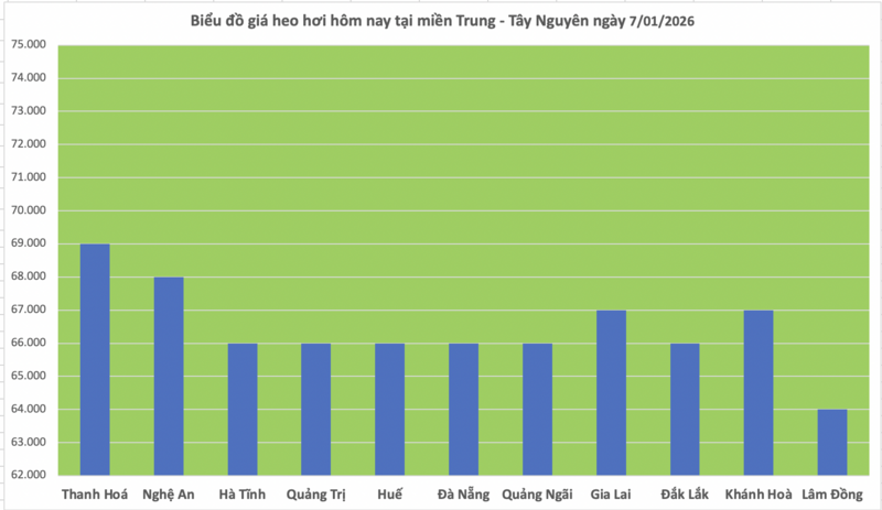 Các địa phương gồm Hà Tĩnh, Quảng Trị, Huế, Đà Nẵng, Quảng Ngãi và Đắk Lắk tiếp tục neo ở mốc 66.000 đồng/kg. Tỉnh Lâm Đồng vẫn là nơi có giá thu mua thấp nhất khu vực với 64.000 đồng/kg.
