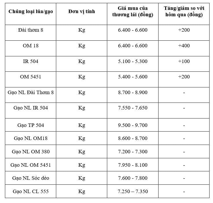 Trong đó với mặt hàng gạo, theo cập nhật từ Sở Nông nghiệp và Môi trường tỉnh An Giang và Lúa gạo Việt, hiện gạo nguyên liệu xuất khẩu IR 504 tăng 50 đồng/kg dao động ở mức 7.550 - 7.650 đồng/kg; gạo nguyên liệu xuất khẩu CL 555 dao động ở mức 7.340 - 7.450 đồng/kg tăng 100 đồng/kg; gạo Đài Thơm 8 dao động 8.700 - 8.900 đồng/kg; gạo nguyên liệu xuất khẩu OM 380 dao động ở mức 7.200 - 7.300 đồng/kg; gạo nguyên liệu xuất khẩu Sóc dẻo dao động ở mức 7.600 - 7.800; gạo nguyên liệu xuất khẩu OM 5451 dao động ở mức 7.950 - 8.100 đồng/kg; gạo nguyên liệu xuất khẩu OM 18 dao động ở mức 8.500 - 8.600 đồng/kg; gạo thành phẩm IR 504 dao động ở 9.500 - 9.700 đồng/kg so với hôm qua.